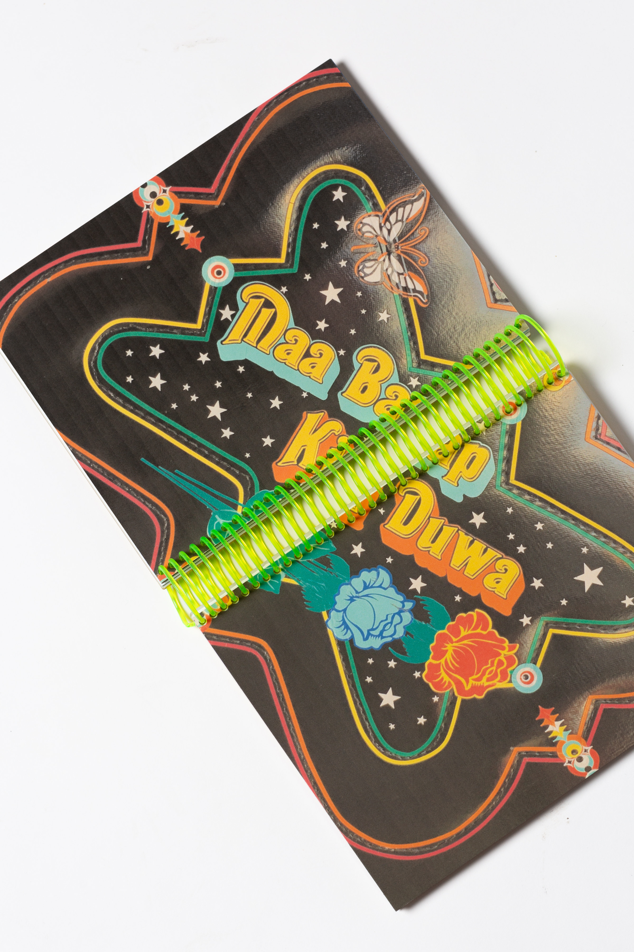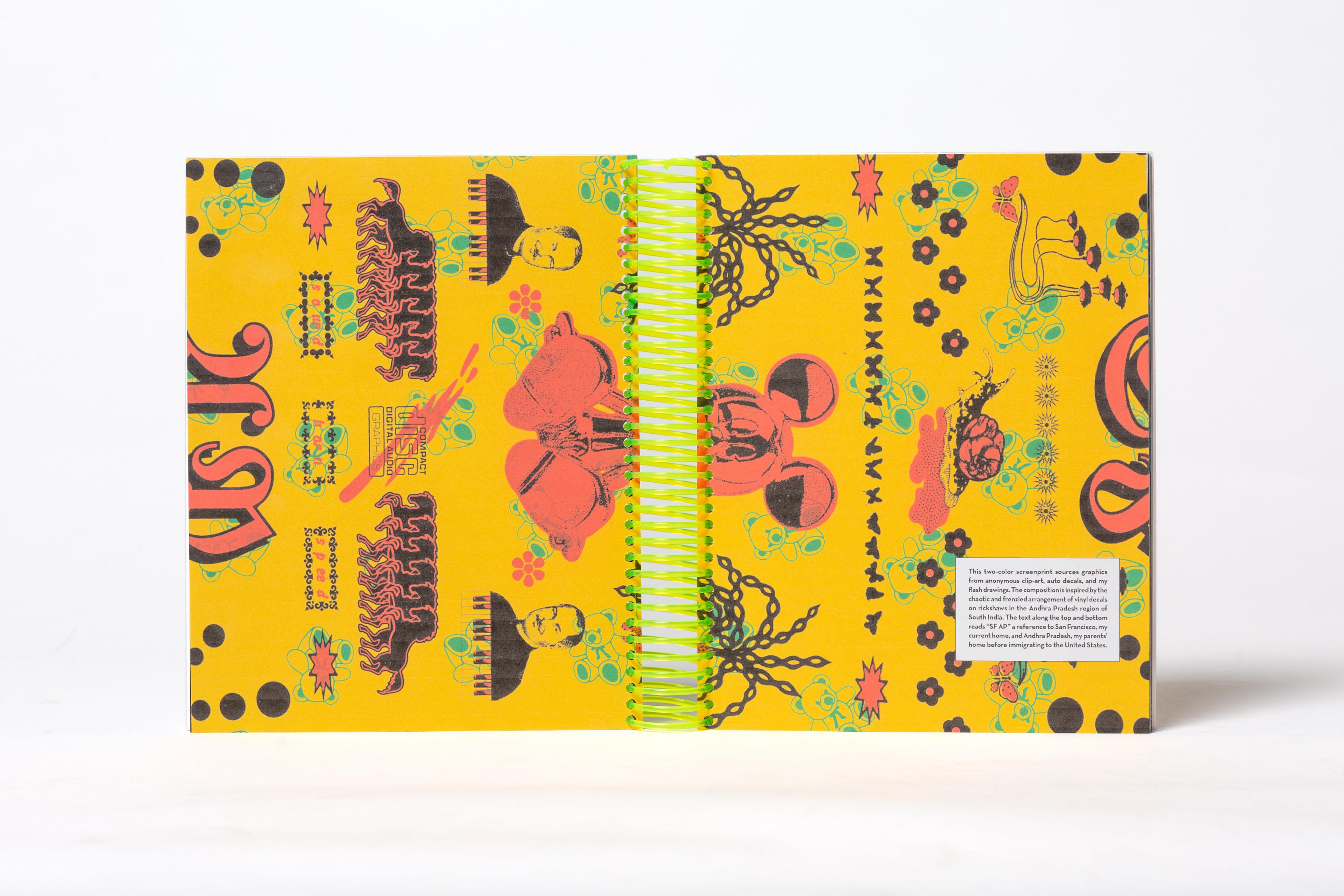 The photo book shown below includes images of auto-rickshaw vinyl decals taken throughout the Andhra Pradesh region of South India. Interspersed with these images are photoshopped images of Bay Area vehicles emulating this style vernacular using “western” image motifs and clip-art. Seeing these images side-by-side highlights the glaring differences in the visual lived-experiences of these two cultures. The front and back covers are laser engraved acrylic with spraypaint accents.